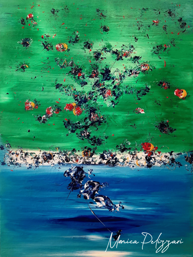 Acrilico su tela 60×80 Quando l’ho dipinta mi sentivo sola.Il silenzio mi spaventava, poi ho capito che poteva diventare la mia forza.Nel verde, nei fiori, nell’acqua ho ritrovato il respiro.Ho ritrovato me stessa.Nel silenzio ho sentito tutto.